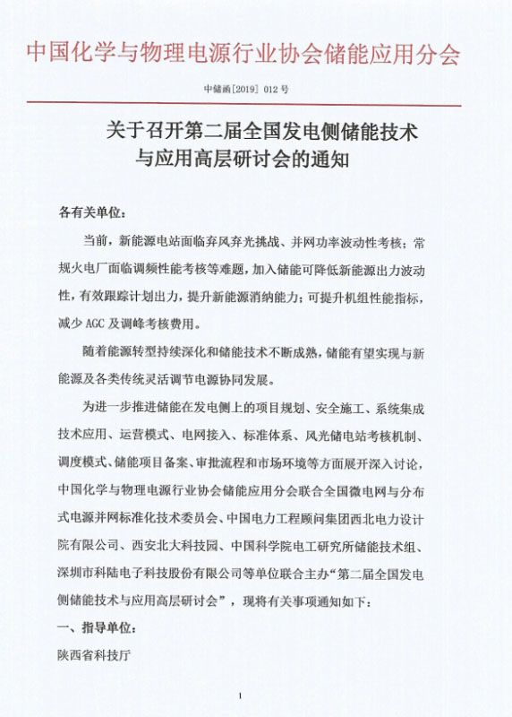 為進一步推進儲能在發(fā)電側(cè)上的項目規(guī)劃、安全施工、系統(tǒng)集成技術(shù)應(yīng)用、運營模式、電網(wǎng)接入、標(biāo)準(zhǔn)體系、風(fēng)光儲電站考核機制、調(diào)度模式、儲能項目備案、審批流程和市場環(huán)境等方面展開深入討論,中國化學(xué)與物理電源行業(yè)協(xié)會儲能應(yīng)用分會聯(lián)合全國微電網(wǎng)與分布式電源并網(wǎng)標(biāo)準(zhǔn)化技術(shù)委員會、中國電力工程顧問集團西北電力設(shè)計院有限公司、西安北大科技園、中國科學(xué)院電工研究所儲能技術(shù)組、深圳市科陸電子科技股份有限公司等單位聯(lián)合主辦“第二屆全國發(fā)電側(cè)儲能技術(shù)與應(yīng)用高層研討會”,現(xiàn)將有關(guān)事項通知如下: