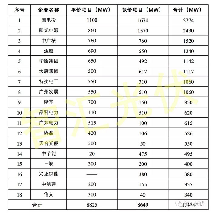 根據(jù)之前公布的第一批平價上網(wǎng)結(jié)果,以及剛剛結(jié)束的競價項目結(jié)果,主要電站投資企業(yè)斬獲的項目規(guī)模如下表所示。