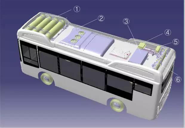燃料電池汽車的碰撞安全主要包括儲氫系統(tǒng)、氫氣管路、燃料電池堆、各類閥門、連接頭等關(guān)鍵部件在發(fā)生碰撞時不能遭受破壞。目前,對燃料電池氫安全的碰撞防護設計除了關(guān)鍵零部件具有防撞能力外,主要通過位置布置、固定裝置保護和慣性開關(guān)監(jiān)控碰撞并與整車監(jiān)控系統(tǒng)聯(lián)動,自動斷電、自動關(guān)閉閥門等措施來避免災難的發(fā)生。例如,燃料電池混合動力客車的高壓儲氫瓶一般放在車輛前置頂部,燃料電池模塊放在客車后置頂部,動力電池放置于地板下方。前置的儲氫瓶,通過車頂部的管路與車輛后部的燃料電池系統(tǒng)連接,在發(fā)生泄露時,氫氣可以迅速排放到大氣中去。燃料電池模塊對車身結(jié)構(gòu)基本無影響,而動力電池放置在地板下方,則兼顧了車身重心低穩(wěn)定性好,如圖2-2所示。