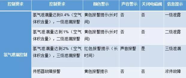 在儲氫瓶口、乘客艙及燃料電池發(fā)動機系統(tǒng)易于聚集和泄漏處均放置多個氫氣泄露傳感器,實時監(jiān)測車內(nèi)的氫含量,一旦發(fā)生氫泄漏立即采取響應處置,確保乘客安全。而且當有任何一個傳感器檢測到的氫體積分數(shù)超過氫爆炸下限(空氣中的氫體積含量為4%)的10%、25%和50%時,監(jiān)控器會分別發(fā)出I級、II級、11I級聲光報警信號。具體控制措施,如表2-1所示。