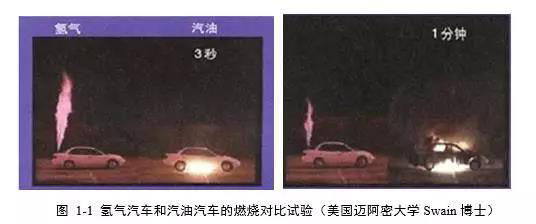 通常情況下,氫的密度僅為空氣的7%(一個標準大氣壓下,0℃下,密度為0.0899g/L),與汽油、丙烷和天然氣相比,具有更大的浮力(快速上升)、擴散性(橫向移動)和快速揮發(fā)性??諝庵泻茈y聚集高濃度的氫,如果發(fā)生泄漏,氫氣會迅速擴散,特別是在開放環(huán)境中,很容易快速逃逸,而不像汽油揮發(fā)后滯留在空氣中不易疏散。美國邁阿密大學的Swain博士做過一個著名的試驗,如圖1-1所示。兩輛汽車分別用氫氣和汽油作燃料,然后進行泄漏點火試驗。點火3秒后,高壓氫氣產(chǎn)生的火焰直噴上方,汽油則從汽車的下部著火;到1分鐘時,用氫氣作燃料的汽車只有漏出的氫氣在燃燒,汽車沒有大問題,而汽油車則早已成為大火球,完全燒光。所以氫氣易揮發(fā)的性質(zhì),與普通汽油車相比,有利于汽車的安全。