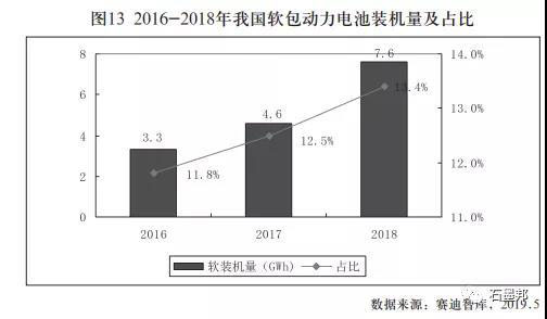 隨著新能源汽車安全性能愈發(fā)受到重視,軟包電池在動(dòng)力電池市 場(chǎng)滲透率穩(wěn)步提升。根據(jù)GBII的統(tǒng)計(jì),2018年我國(guó)軟包動(dòng)力電池裝機(jī)量約為7.6GWh,同比增長(zhǎng)65.2%, 增速較2017年提高25.8個(gè)百分點(diǎn);軟包電池約占當(dāng)年我國(guó)動(dòng)力裝機(jī)量的13.4%,而在2017年、2016年這一數(shù)據(jù)還分別為12.5%和11.8%,2018年軟包動(dòng)力電池占比增幅為 0.9個(gè)百分點(diǎn),增幅較2017年提高 0.2個(gè)百分點(diǎn)。
