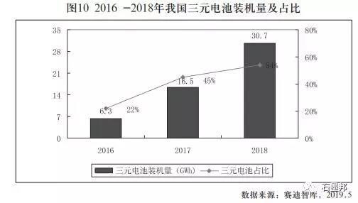 2017年以來,我國(guó)新能源汽車補(bǔ)貼加大了對(duì)高能量密度動(dòng)力電池的支持力度。三元電池憑借高能量密度優(yōu)勢(shì)快速崛起,強(qiáng)勢(shì)改變動(dòng) 力電池市場(chǎng)格局。2017年三元電池裝機(jī)量達(dá)到了16.5GWh,增幅近10GWh,占動(dòng)力電池裝機(jī)量的比重達(dá)45%,較2016年的22%提高了23個(gè)百分點(diǎn)。2018年,我國(guó)動(dòng)力電池裝機(jī)量達(dá)到了57GWh,其中三元電池裝機(jī)量30.7GWh,同比增長(zhǎng)91.7%,占動(dòng)力電池裝機(jī)量的比重達(dá)54%,較2017年提高了9個(gè)百分點(diǎn)。隨著三元電池能量密度和安全性不斷提 升,其在動(dòng)力電池市場(chǎng)占比將穩(wěn)步提升。