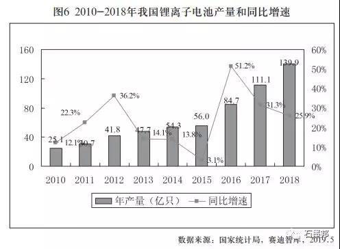 2018年我國(guó)新能源汽車產(chǎn)量達(dá)到127萬(wàn)輛,同比增長(zhǎng)了59.9%,增速較上年提高6個(gè)百分點(diǎn),呈現(xiàn)加速增長(zhǎng)態(tài)勢(shì)。在此帶動(dòng)下,2018年我國(guó)鋰離子電池產(chǎn)量持續(xù)快速增長(zhǎng)。國(guó)家統(tǒng)計(jì)局?jǐn)?shù)據(jù)顯示,全年我國(guó)鋰離子電池累計(jì)產(chǎn)量達(dá)139.9億只,再次創(chuàng)下歷史新高,同比增長(zhǎng)25.9%,增速較2017年小幅回落。按容量計(jì)算,2018年我國(guó)鋰離子電池產(chǎn)量 124.2GWh,同比增長(zhǎng)23.1%。