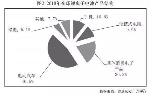 按容量計(jì)算,2018年消費(fèi)類鋰離子電池(含手機(jī)、便攜式電腦和其他消費(fèi)電子產(chǎn)品)占比40.7%, 比 2 0 1 7年下降了7.3個(gè)百分點(diǎn);電動(dòng)汽車用鋰離子電池占比達(dá)到46.5%,首次超過消費(fèi)類鋰離子電池,而2017年電動(dòng)汽車用鋰離子電池占比還只有40%;儲(chǔ)能用鋰離子電池占比達(dá)到了5.1%,較2017年增長(zhǎng)了0.7個(gè)百分點(diǎn);其他用途(含電動(dòng)工具、電動(dòng)自行車等)鋰離子電池占比為7.7%,基本與2017年持平。電動(dòng)汽車用鋰離子電池已經(jīng)成 為拉動(dòng)全球鋰離子電池產(chǎn)業(yè)增長(zhǎng)的主要?jiǎng)恿Γ?018年其對(duì)全球鋰離子電池產(chǎn)業(yè)增長(zhǎng)的貢獻(xiàn)率72.5%。