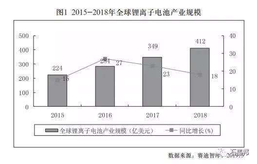 在全球電動(dòng)汽車市場(chǎng)快速增長(zhǎng)帶動(dòng)下,全球鋰離子電池繼續(xù)保 持快速增長(zhǎng)勢(shì)頭。2018年全球鋰離子電池產(chǎn)業(yè)規(guī)模首次突破400億美元,達(dá)到412億美元,同比增長(zhǎng)18%,增速較2017年小幅下滑了5個(gè)百分點(diǎn)。