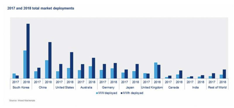 Wood Mackenzie公司指出,中國政府在儲(chǔ)能領(lǐng)域的積極政策激勵(lì)是促進(jìn)該行業(yè)快速增長的主要原因,也是儲(chǔ)能部署的主要推動(dòng)力。中國2018年部署的儲(chǔ)能容量為580MW/1.14GWh,儲(chǔ)能市場規(guī)模累計(jì)達(dá)到1.07GW/1.98GWh,并且已經(jīng)確立其在亞太地區(qū)第二大儲(chǔ)能市場的地位。而在儲(chǔ)能部署方面,韓國在亞太地區(qū)仍名列首位。Wood Mackenzie公司對(duì)于中國2018年儲(chǔ)能市場增長進(jìn)行的評(píng)論說,“中國電網(wǎng)側(cè)(FTM)儲(chǔ)能部署大幅增長,與2017年相比,2018年的裝機(jī)容量增長了五倍。”