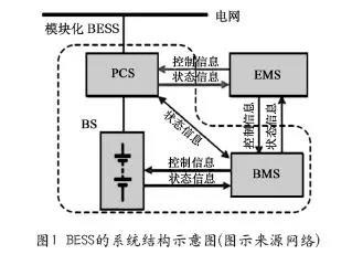 BESS主要由電池系統(tǒng)(Battery System,BS)、功率轉(zhuǎn)換系統(tǒng)(Power Conversion System,PCS)、電池監(jiān)系統(tǒng)(Battery Monitoring System,BMS)、電能管理系統(tǒng)(Energy Management System,EMS)等4部分組成;同時,在實際應用中,為便于設(shè)計、管理及控制通常將電池系統(tǒng)、PCS、BMS重新組合成模塊化BESS,而EMS主要用于監(jiān)測、管理與控制一個或多個模塊化BESS。圖1為BESS的系統(tǒng)結(jié)構(gòu)示意圖。