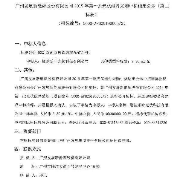 中國(guó)儲(chǔ)能網(wǎng)訊:日前,隆基中標(biāo)廣州發(fā)展新能源股份有限公司2019年首批光伏組件采購(gòu),總規(guī)模20MW,為隆基Hi-MO 4雙面420W高效組件。由此可見(jiàn),綜合產(chǎn)品性價(jià)比及企業(yè)成本來(lái)看,高效組件在實(shí)際投資中更具優(yōu)勢(shì)。