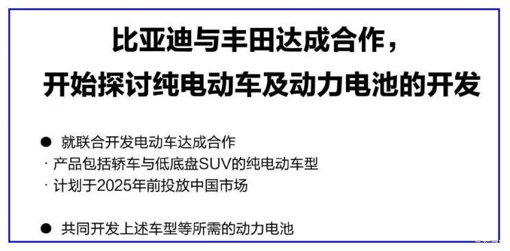 前腳豐田剛和動(dòng)力電池領(lǐng)域“新貴”寧德時(shí)代“官宣”,后腳又牽手了行業(yè)“大佬”比亞迪,不過后者合作不僅限于動(dòng)力電池。7月19日,比亞迪股份有限公司(以下簡(jiǎn)稱“比亞迪”)與豐田汽車公司(以下簡(jiǎn)稱“豐田”)簽訂合約,雙方將共同開發(fā)轎車和低底盤SUV的純電動(dòng)車型,以及上述產(chǎn)品等所需的動(dòng)力電池。