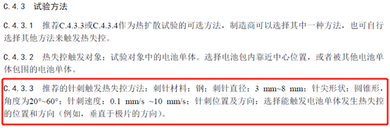 雖然新國(guó)標(biāo)中取消了電池單體的針刺試驗(yàn),但有意思的是,在新國(guó)標(biāo)附錄C關(guān)于熱擴(kuò)散乘員保護(hù)分析與驗(yàn)證報(bào)告中,推薦作為熱擴(kuò)散試驗(yàn)的可選方法里出現(xiàn)了針刺觸發(fā),同時(shí)《準(zhǔn)入管理規(guī)定》里“暫不執(zhí)行”的描述也較為曖昧,這對(duì)未來是否會(huì)恢復(fù)針刺試驗(yàn)留下了一個(gè)猜想的空間。