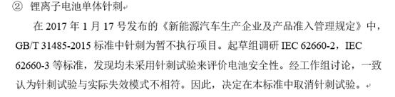 而在去年1月25日發(fā)布的征求意見稿編制說明中,再次解釋了取消針刺實(shí)驗(yàn)的原因。除了《準(zhǔn)入管理規(guī)定》里明確針刺實(shí)驗(yàn)暫不執(zhí)行以外,起草組對(duì)于IEC等標(biāo)準(zhǔn)調(diào)研發(fā)現(xiàn)沒有采用針刺和認(rèn)為針刺試驗(yàn)與實(shí)際失效模式不相符是決定新國(guó)標(biāo)中取消針刺試驗(yàn)的另外兩個(gè)原因。