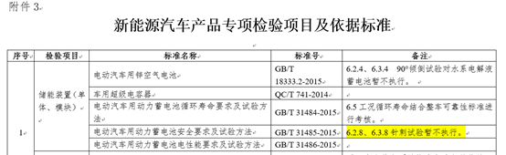 不過從相關(guān)文件查閱可以看到,早在2017年7月1日開始施行的《新能源汽車生產(chǎn)企業(yè)及產(chǎn)品準(zhǔn)入管理規(guī)定》(以下簡(jiǎn)稱“準(zhǔn)入管理規(guī)定”)的附件3中就提到針刺實(shí)驗(yàn)暫不執(zhí)行。