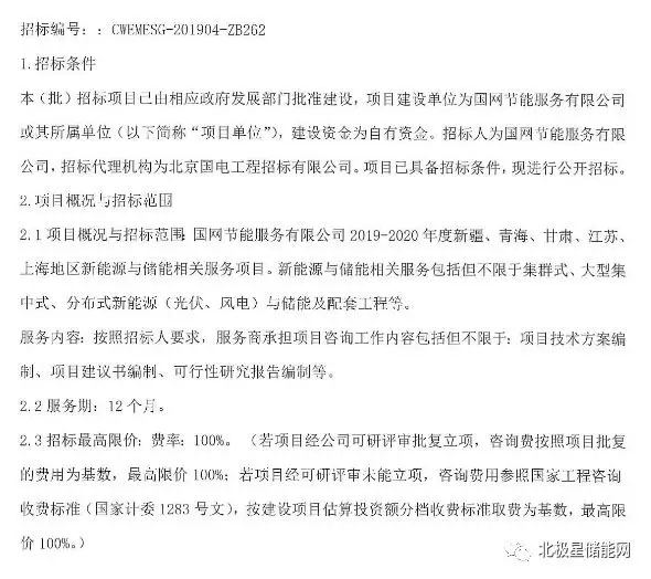 中國(guó)儲(chǔ)能網(wǎng)訊:據(jù)了解,國(guó)網(wǎng)節(jié)能公司正在進(jìn)行2019-2020年度新疆、青海、甘肅、江蘇、上海地區(qū)新能源與儲(chǔ)能相關(guān)服務(wù)項(xiàng)目招標(biāo),公告顯示招標(biāo)的新能源與儲(chǔ)能相關(guān)服務(wù)包括但不限于集群式、大型集中式、分布式新能源(光伏、風(fēng)電)與儲(chǔ)能及配套工程等。服務(wù)內(nèi)容包括但不限于:項(xiàng)目技術(shù)方案編制、項(xiàng)目建議書編制、可行性研究報(bào)告編制等項(xiàng)目咨詢工作。以下附招標(biāo)文件: