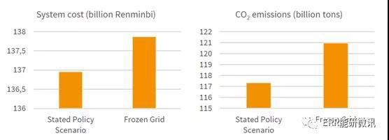 本文展示了基于場景建模結(jié)果的高級多標準電網(wǎng)規(guī)劃方法的優(yōu)勢。它將實施了優(yōu)化規(guī)劃和電網(wǎng)擴建的中國可再生能源展望(CREO)2018既定政策情景與沒有電網(wǎng)規(guī)劃和電網(wǎng)擴建的情景(這意味著電網(wǎng)將保持不變)進行了比較。仿真模擬結(jié)果表明,合理規(guī)劃的電網(wǎng)可以降低整體系統(tǒng)成本和排放,更好地整合可再生能源,減少限電,如下圖所示。