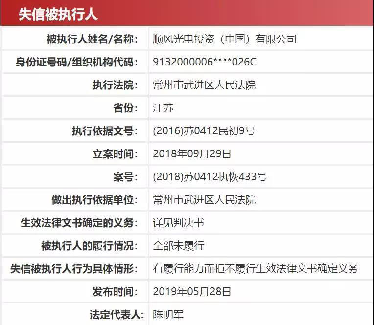 去年12月,順風(fēng)光電因牽涉融信租賃的一筆糾紛,被法院列為失信被執(zhí)行人。