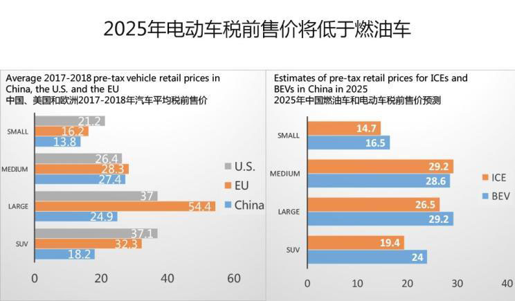 而彭博社《2019年新能源汽車長期展望報(bào)告》 則進(jìn)一步驗(yàn)證了兩位教授的觀點(diǎn)。報(bào)告稱,自2010年以來,在規(guī)模經(jīng)濟(jì)和技術(shù)進(jìn)步的共同作用下,鋰離子電池每千瓦時(shí)的平均成本已下降了85%。到2025年左右,幾乎在所有主要市場電動車的購置成本和運(yùn)行成本都將比燃油車(ICE)更便宜。下邊是彭博社的預(yù)測圖: