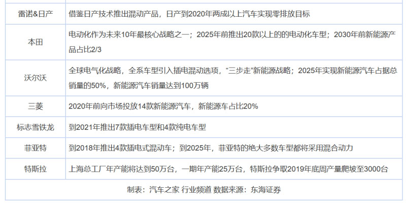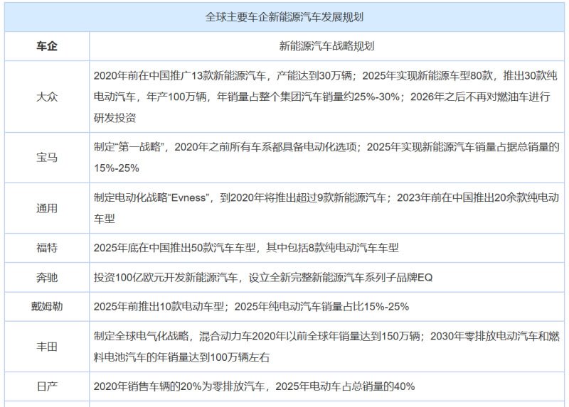第三個(gè)是全球主要車企的新能源汽車發(fā)展規(guī)劃,國內(nèi)的這個(gè)就不列了,可以拍胸脯說,全部車企都有比國外要激進(jìn)的新能源汽車規(guī)劃。各大車企都在快速推進(jìn)電動化,而且不少國際企業(yè)迅速展開對中國市場的專門規(guī)劃。