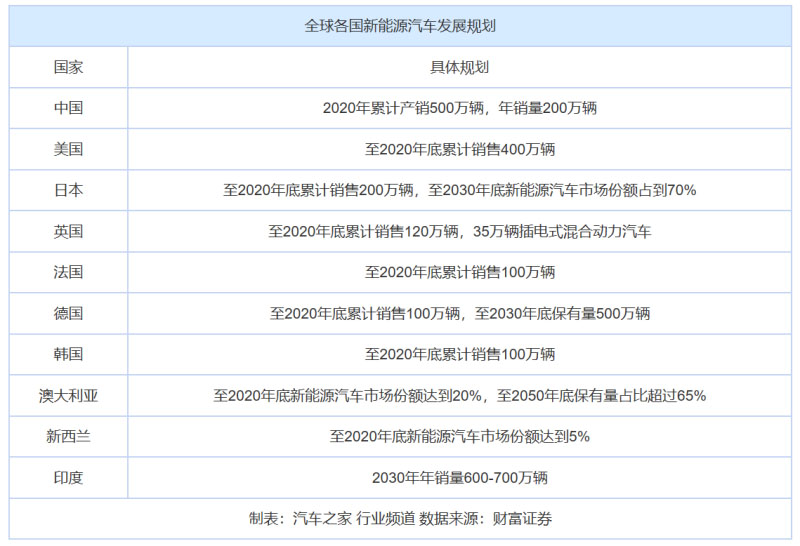 第二個(gè)是全球各國新能源汽車發(fā)展規(guī)劃,各國的2020規(guī)劃,普遍都在百萬量級以上。