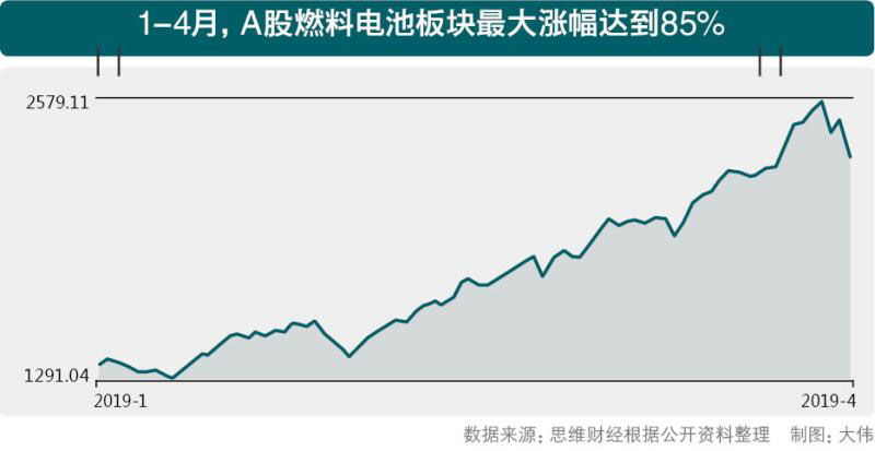一波炒作之下,氫能、燃料電池被資本追捧,1-4月,A股燃料電池板塊最大漲幅達(dá)到85%,遠(yuǎn)高于同期大盤漲幅。