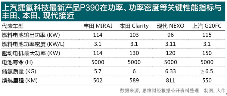 如果說億華通走的是一條“技術(shù)找資金”的道路,那上汽則恰好相反。在與同濟(jì)等方合作之后,上汽始終謀求自主掌控。2006年,上汽成立燃料電池事業(yè)部,此后無論市場(chǎng)環(huán)境如何變動(dòng)、內(nèi)部架構(gòu)如何調(diào)整,團(tuán)隊(duì)仍然保持。2018年,上汽將燃料電池研發(fā)團(tuán)隊(duì)獨(dú)立,成立捷氫科技,其最新產(chǎn)品P390在功率、功率密度等關(guān)鍵性能指標(biāo)已和豐田、現(xiàn)代接近。