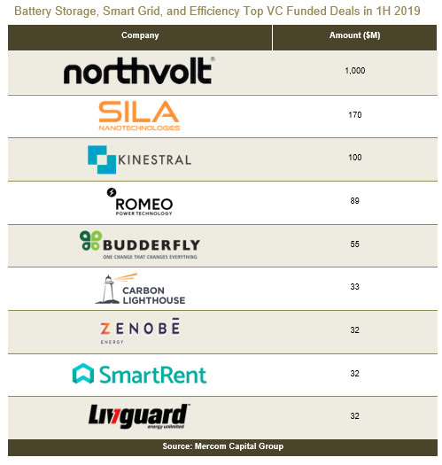 Mercom公司調查還發(fā)現(xiàn),電池儲能、能源效率和智能電網(wǎng)的企業(yè)融資總額從2018年上半年的61筆交易中的24億美元略微下降至2019年上半年的51筆交易中的23億美元。
