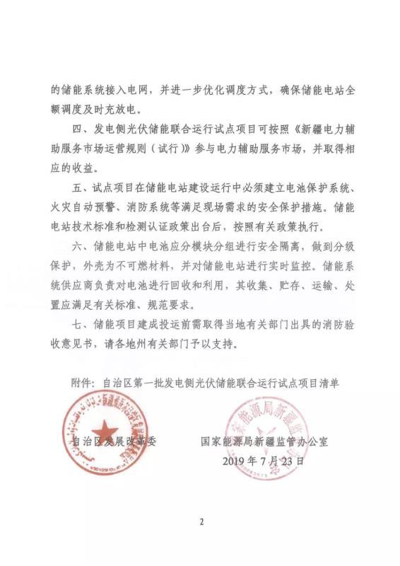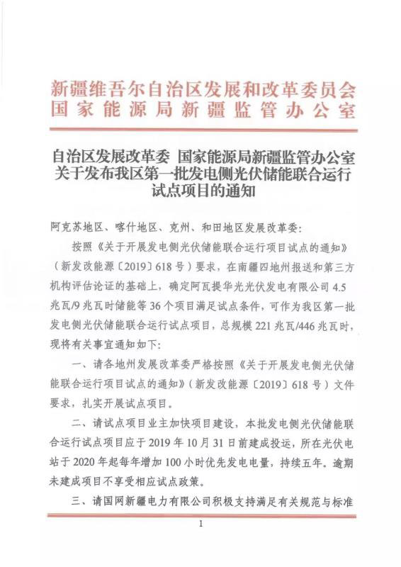 中國(guó)儲(chǔ)能網(wǎng)訊:2019年7月23日,新疆發(fā)改委發(fā)布發(fā)布《新疆第一批發(fā)電側(cè)光儲(chǔ)聯(lián)合運(yùn)行試點(diǎn)項(xiàng)目清單》,共確定36個(gè)光儲(chǔ)項(xiàng)目滿(mǎn)足試點(diǎn)條件,總規(guī)模為221MW/446MWh,參與儲(chǔ)能項(xiàng)目建設(shè)的企業(yè)有北控清潔、國(guó)能馭新、智光儲(chǔ)能、易事特、陽(yáng)光電源、國(guó)網(wǎng)節(jié)能、上海動(dòng)力、猛獅科技、天合光能、比克電池10家公司。