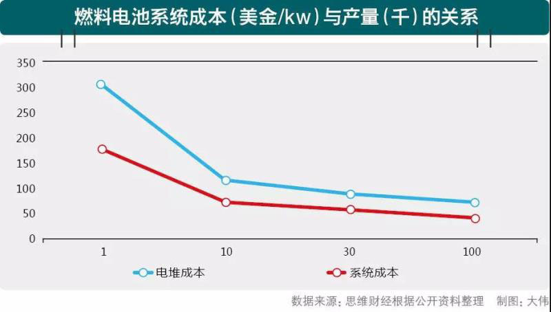 2018年,國內(nèi)氫燃料電池汽車產(chǎn)量僅1619輛。隨著生產(chǎn)規(guī)模擴大,成本有望迅速下降,美國能源部預計從年產(chǎn)1千套到10萬套,燃料電池系統(tǒng)成本有望降低七成左右。
