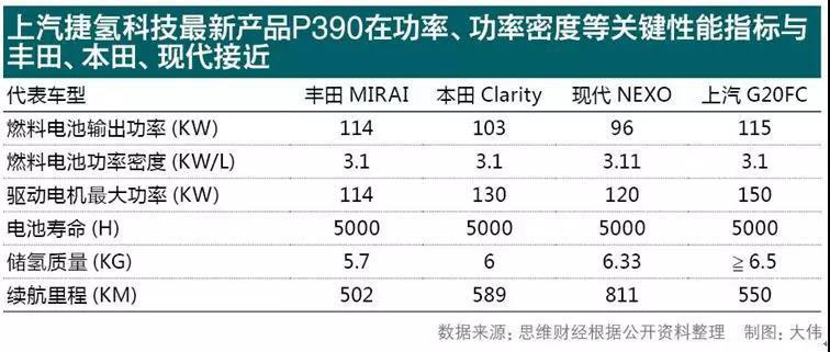 如果說億華通走的是一條“技術(shù)找資金”的道路,那上汽則恰好相反。在與同濟等方合作之后,上汽始終謀求自主掌控。2006年,上汽成立燃料電池事業(yè)部,此后無論市場環(huán)境如何變動、內(nèi)部架構(gòu)如何調(diào)整,團隊仍然保持。2018年,上汽將燃料電池研發(fā)團隊獨立,成立捷氫科技,其最新產(chǎn)品P390在功率、功率密度等關鍵性能指標已和豐田、現(xiàn)代接近。