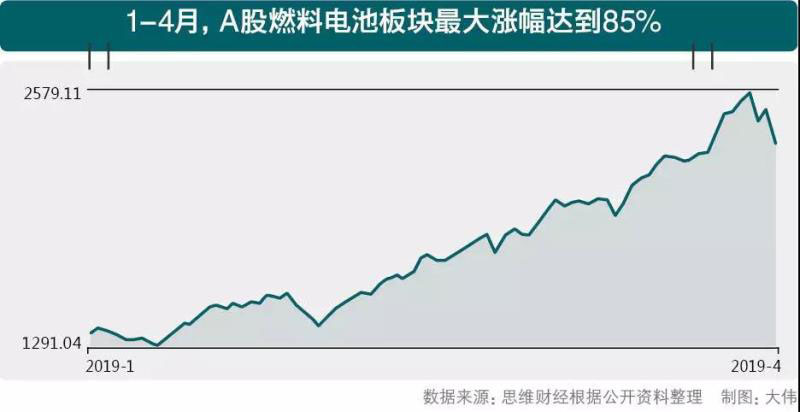 一波炒作之下,氫能、燃料電池被資本追捧,1-4月,A股燃料電池板塊最大漲幅達到85%,遠高于同期大盤漲幅。