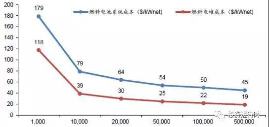 2017年美國燃料電池系統(tǒng)年產(chǎn)50萬套成本已從2006年的124美元/Kw下降到45美元/Kw,根據(jù)DOE《Fuel Cell System Cost–2017》的預(yù)測,2020年將下降到40美元/Kw。當(dāng)產(chǎn)量達(dá)到50萬臺(tái)套時(shí),規(guī)模效應(yīng)將加速成本下降,燃料電池系統(tǒng)的成本將下降到45$/kWnet,電堆成本將下降到19$/kWnet。