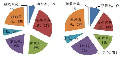 從燃料電池發(fā)動(dòng)機(jī)成本構(gòu)成來看,以年產(chǎn)200套公交車為例,電堆成本占比70%(其中質(zhì)子交換膜27%、催化劑19%、擴(kuò)散層19%、雙極板5%),輔助系統(tǒng)占比22%。