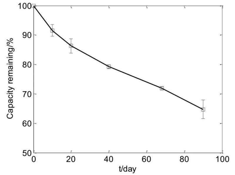 圖2. 55 ℃存儲電池容量保持率同存儲時間關(guān)系曲線。