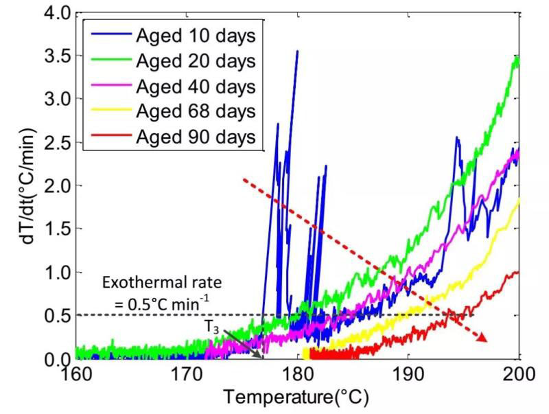 如圖4所示,與圖3結(jié)果類似,隨著存儲時間的延長同等溫度下老化電池的自產(chǎn)熱速率不斷降低,表明老化后電池的熱穩(wěn)定性確實提高。作者推測原因可能是:(1)老化過程消耗了電池活性材料,導(dǎo)致熱失控階段活性材料量減少;(2)老化形成的非活性層覆蓋住了部分活性位點,使得熱失控過程副反應(yīng)程度降低。