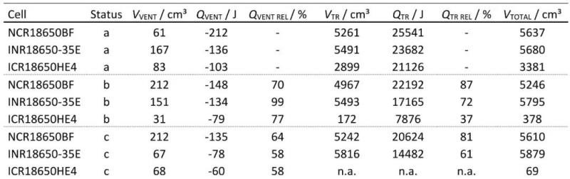 表2. 三種不同電池新鮮狀態(tài)(Status a)、循環(huán)老化后(Status b)和60 ℃存儲老化后(Status c)加熱測試特征對比。其中TVENT為首次開閥溫度,TONSET為電池自產(chǎn)熱溫度,TTR為開始熱失控瞬間溫度,TMAX為熱失控過程最高溫度。