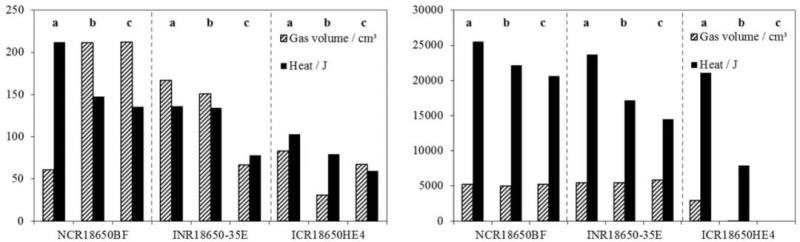 表2和表3對比三種不同電池在新鮮狀態(tài)(Status a)、循環(huán)老化后(Status b)和60 ℃存儲老化后(Status c)加熱測試的特征。其中,ICR18650HE4電池高溫存儲老化后加熱未發(fā)生熱失控。從表3可以看出,相比新鮮電池,循環(huán)老化和高溫存儲老化后的電池在開閥和熱失控過程的熱交換均有所降低。ICR18650HE4電池老化后無論是產(chǎn)氣量還是放熱量較新鮮電池均有顯著降低,且無論哪種狀態(tài)ICR18650HE4電池的產(chǎn)氣量和放熱量均是最低的。新鮮狀態(tài)下,NCR18650BF的開閥產(chǎn)氣量低于INR18650-35E,而按兩種方式老化后則是NCR18650BF的開閥產(chǎn)氣量高于INR18650-35E。更為重要的是,從總產(chǎn)熱量看,高溫存儲老化后電池的產(chǎn)熱量更低,表明高溫存儲老化后電池的熱穩(wěn)定性更高。