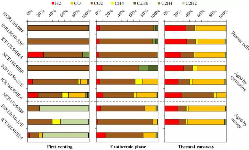圖4的信息量非常大,需要仔細琢磨?,F(xiàn)重點分析NCR18650BF和INR18650-35E兩款電池在不同狀態(tài)首次開閥時的氣體特征。在新鮮狀態(tài),兩款電池首次開閥釋放的氣體均為CO2。循環(huán)老化后首次開閥,NCR18650BF釋放的還是CO2,而INR18650-35E釋放的氣體除了CO2,還有H2、CH4、CO等。高溫存儲老化后NCR18650BF釋放的大部分是C2H2,剩下的為CO2;而INR18650-35E釋放的氣體中CO2和C2H2分別各占40%,CH4占到20%。