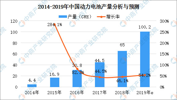 近年來,我國動(dòng)力鋰離子電池發(fā)展迅猛,主要得益于國家政策對新能源汽車產(chǎn)業(yè)的大力支持。2018年中國新能源汽車產(chǎn)量同比增長50.62%,達(dá)122萬輛,產(chǎn)量為2014年的14.66倍。受新能源汽車市場發(fā)展帶動(dòng),2017-2018年中國動(dòng)力電池市場保持高速增長,調(diào)研統(tǒng)計(jì),2018年中國動(dòng)力電池市場產(chǎn)量同比增長46.07%,達(dá)65GWh。