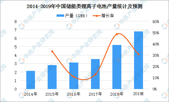 我國儲(chǔ)能類鋰離子電池領(lǐng)域雖然市場空間巨大,但目前受成本、技術(shù)等因素限制,仍處于市場導(dǎo)入期。2018年中國儲(chǔ)能類鋰離子電池產(chǎn)量同比增加48.57%,達(dá)5.2GWh。預(yù)計(jì)2019年中國儲(chǔ)能類鋰離子電池產(chǎn)量達(dá)6.8GWh。