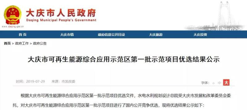 今日,黑龍江大慶市可再生能源綜合應(yīng)用示范區(qū)第一批示范項(xiàng)目?jī)?yōu)選結(jié)果,已在大慶市人民政府官網(wǎng)上公示。通威、陽光、京能、東方日升、國(guó)家電投、華能等8家單位中標(biāo)。