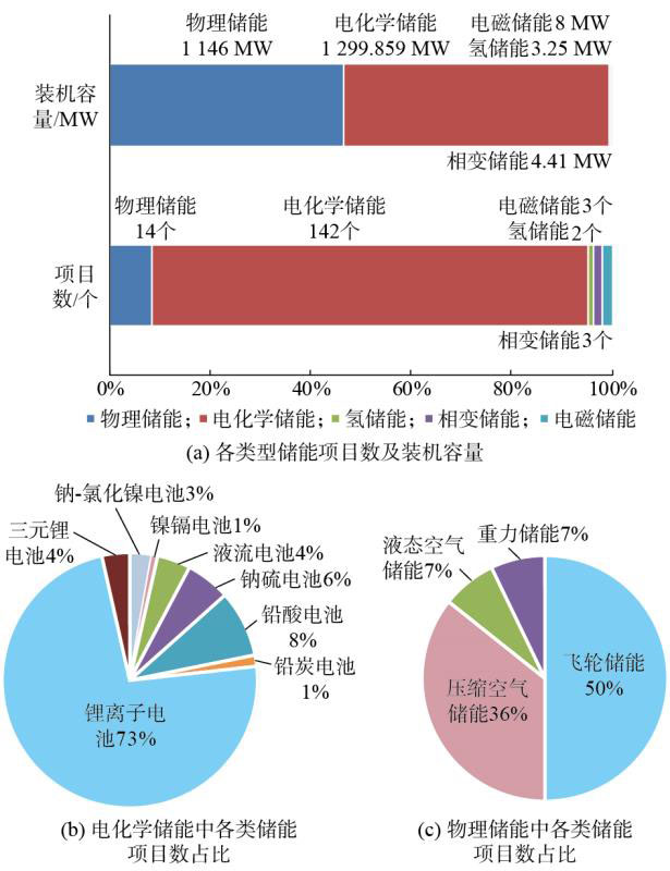 由圖 1(a)可知,兆瓦級(jí)儲(chǔ)能調(diào)頻工程中,物理儲(chǔ)能項(xiàng)目數(shù)少、單項(xiàng)容量大,電化學(xué)儲(chǔ)能項(xiàng)目數(shù)逾百、單項(xiàng)容量小,氫儲(chǔ)能、相變儲(chǔ)能的調(diào)頻規(guī)模應(yīng)用則顯稀少。此外,綜合圖 1(a),(b),(c)可知,項(xiàng)目數(shù)最多的電化學(xué)儲(chǔ)能中鋰離子電池占據(jù)全部電化學(xué)儲(chǔ)能調(diào)頻項(xiàng)目73%,物理儲(chǔ)能裝機(jī)容量接近全部兆瓦級(jí)調(diào)頻儲(chǔ)能容量50%,以飛輪儲(chǔ)能、壓縮空氣儲(chǔ)能項(xiàng)目數(shù)居多。