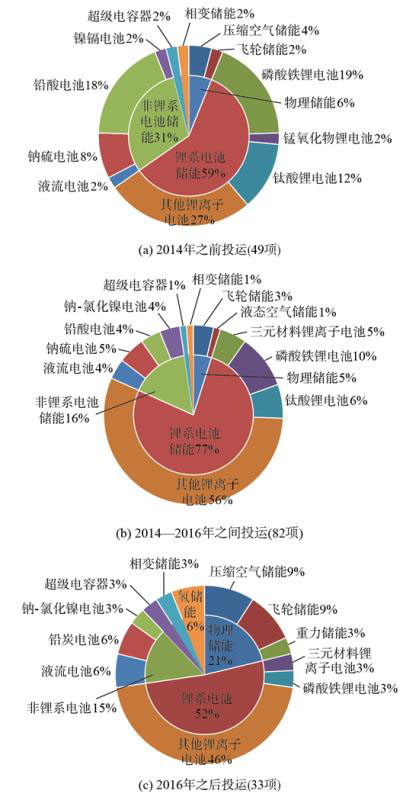 為分析實(shí)際調(diào)頻項(xiàng)目中儲(chǔ)能類型結(jié)構(gòu)變化趨勢(shì),將前述164項(xiàng)工程數(shù)據(jù)按投運(yùn)時(shí)間統(tǒng)計(jì)為2014年前、2014年至2016年之間、2016年后三個(gè)時(shí)期。同時(shí)為了解電化學(xué)儲(chǔ)能子類結(jié)構(gòu),將全部?jī)?chǔ)能劃分為物理儲(chǔ)能、鋰系電池儲(chǔ)能、非鋰系電池儲(chǔ)能、超級(jí)電容器、相變儲(chǔ)能和氫儲(chǔ)能,再進(jìn)行二級(jí)結(jié)構(gòu)剖分得到圖 2。圖中:其他鋰離子電池指DOE統(tǒng)計(jì)資料未給明具體類型的鋰離子電池; 百分比有舍入誤差。