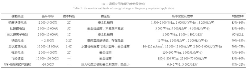 表1調(diào)頻應(yīng)用儲(chǔ)能的參數(shù)及特點(diǎn)