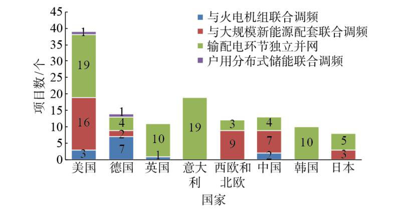 圖3部分國(guó)家地區(qū)各運(yùn)行模式兆瓦級(jí)儲(chǔ)能調(diào)頻項(xiàng)目分布