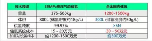 下圖是研發(fā)方給出的低壓固態(tài)儲(chǔ)氫技術(shù)(合金固態(tài)儲(chǔ)氫)與國(guó)內(nèi)主流的35MPa高壓儲(chǔ)氫的數(shù)據(jù)對(duì)比。從圖中可以看出,低壓儲(chǔ)氫的優(yōu)勢(shì)主要在于需要的儲(chǔ)氫設(shè)備的體積小,加氫站設(shè)備成本低。但劣勢(shì)在于儲(chǔ)氫罐重量大,儲(chǔ)氫系統(tǒng)成本高。
