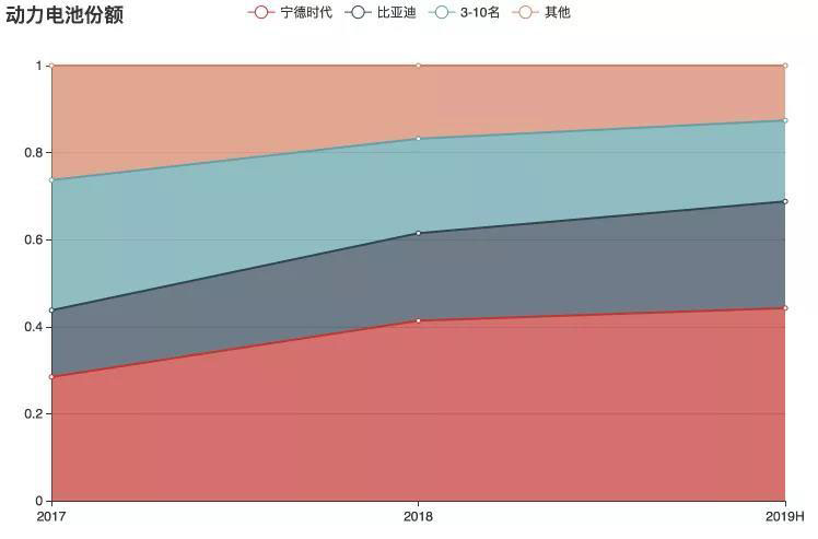 2019上半年,裝機量排名第3到10名企業(yè)合計裝機量5.6GWh,合計份額占總裝機量18.6%,較去年21.7%的份額進一步下降。而對應的是,寧德時代和比亞迪裝機量占比達到全行業(yè)的68.9%,較去年的份額,市場份額進一步向第一梯隊集中。
