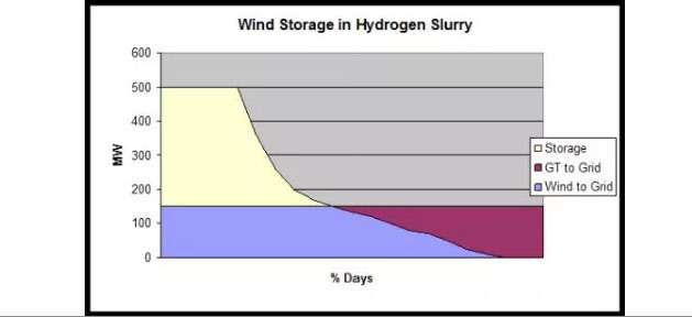 其二是使用氫懸浮液將風能儲存起來。風不可能一年四季不間斷的吹,而電網又不能僅僅依靠風力發(fā)電供應所有的電能。一般說來,風力發(fā)電廠輸出的電能只有15%可作為可靠能量。這意味著對于一個500兆瓦的風力發(fā)電廠,僅僅有75兆瓦被ISO視為可發(fā)電的能量。通常為保證風力發(fā)電輸出電能的穩(wěn)定性,需要附加一個天然氣電廠,這就在一定程度上影響了風力發(fā)電的零碳排放。以下是一個500兆瓦風力發(fā)電廠提供的150兆瓦發(fā)電量100%用氫儲存并驅動燃氣輪機發(fā)電的例子。在這個例子中,ISO認為風力發(fā)電占電網30%的電能。