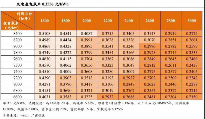 2018年全國風(fēng)電平均利用小時(shí)數(shù)2095小時(shí),考慮到7%的棄風(fēng)率,實(shí)際平均利用小時(shí)數(shù)1948小時(shí),以7500元/kW投資成本測算,目前全國風(fēng)電度電成本約為0.3656元/kWh,低于光伏發(fā)電度電成本。