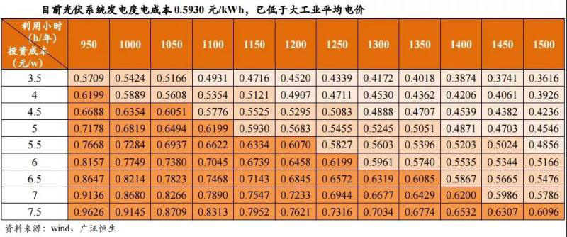 全國大工業(yè)電價(jià)的均價(jià)為0.61元/kWh。以光伏系統(tǒng)投資成本5元/W,全國平均年有效利用小時(shí)1150小時(shí)計(jì)算,目前光伏系統(tǒng)發(fā)電成本0.5930元/kWh,已經(jīng)低于大工業(yè)電價(jià)。