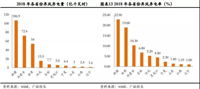 2018年棄風(fēng)棄電率排名前三的省份分別為新疆、內(nèi)蒙古和甘肅,全國平均棄風(fēng)棄電率為7%,這三個(gè)省份均超過了10%。由于可再生資源豐富,西北省份也是電價(jià)最低的地區(qū)。